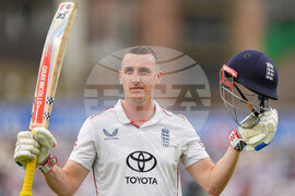 FILE - England's Harry Brook acknowledge the fans as he walks off the field after losing his wicket on day four of the fifth cricket test match between England and India at The Kia Oval in London, Sunday, Aug. 3, 2025. (AP Photo/Kirsty Wigglesworth, file)