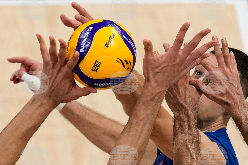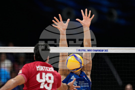 Pavle Peric of Serbia is blocked by Iran players during their round of 16 match at the 2025 FIVB Volleyball Men's World Championship at the Mall of Asia Arena in Pasay city, Philippines on Tuesday Sept. 23, 2025. (AP Photo/Aaron Favila)