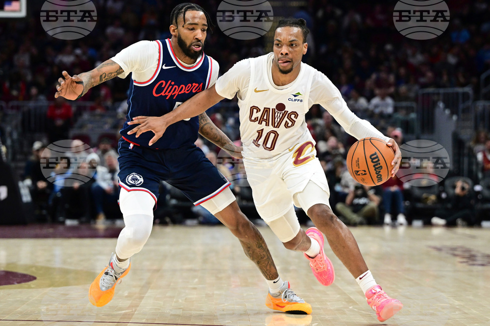 FILE-Cleveland Cavaliers guard Darius Garland drives on Los Angeles Clippers forward Derrick Jones Jr. in the second half of an NBA basketball game Sunday, March 30, 2025, in Cleveland. (AP Photo/David Dermer, FILE )