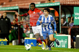 Brighton and Hove Albion's Carlos Baleba, left, and Barnsley's Vimal Yoganathan in action during the English League Cup third round soccer match between Barnsley and Brighton & Hove Albion at Oakwell Stadium, Barnsley, England, Tuesday Sept. 23, 2025. (Cody Froggatt/PA via AP)