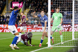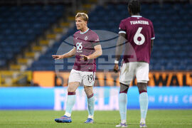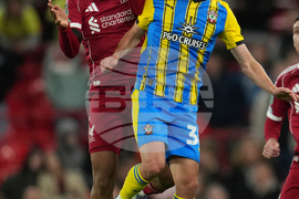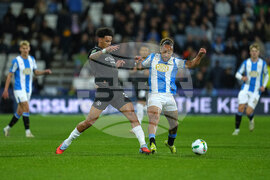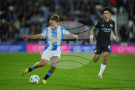 Huddersfield's Marcus Harness shoots the ball during the English League Cup third round soccer match between Huddersfield and Manchester City at the John Smith's stadium, in Huddersfield, England, Wednesday, Sept. 24, 2025. (AP Photo/Jon Super),