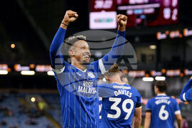Cardiff City's Callum Robinson celebrates scoring during the English League Cup third round match between Burnley and Cardiff City at Turf Moor, Burnley, England, Tuesday Sept. 23, 2025. (Gary Oakley/PA via AP)