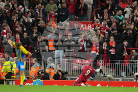Liverpool's Alexander Isak celebrates after scoring the opening goal of his team during the English League Cup third round soccer match between Liverpool and Southampton at the Anfield stadium in Liverpool, England, Tuesday, Sept. 23, 2025. (AP Photo/Jon Super)