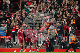 Liverpool's manager Arne Slot applauds the fans after the English League Cup third round soccer match between Liverpool and Southampton at the Anfield stadium in Liverpool, England, Tuesday, Sept. 23, 2025. (AP Photo/Jon Super)