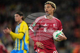 Liverpool's Hugo Ekitike holds the ball during the English League Cup third round soccer match between Liverpool and Southampton at the Anfield stadium in Liverpool, England, Tuesday, Sept. 23, 2025. (AP Photo/Jon Super)