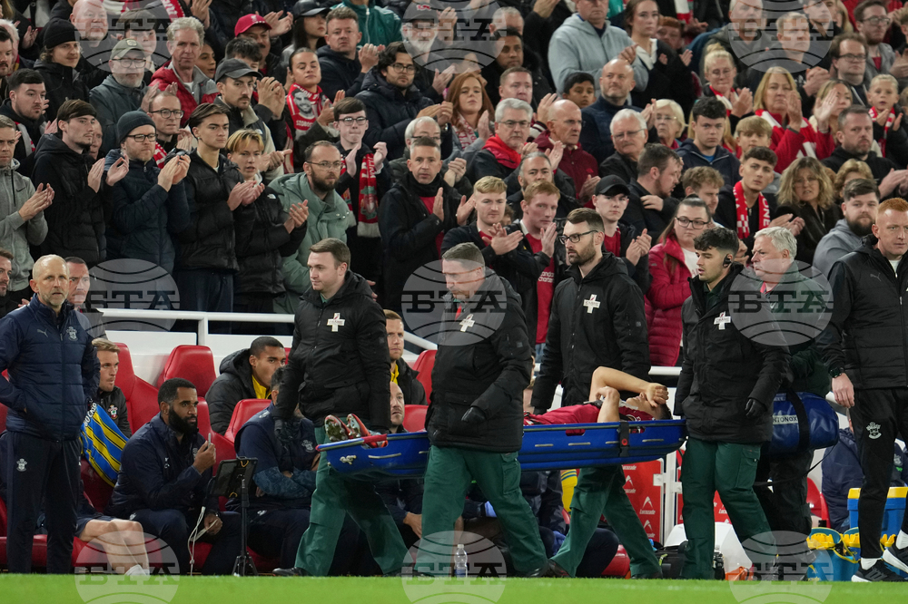 Paramedics carry on a stretcher Liverpool's Giovanni Leoni after an injury during the English League Cup third round soccer match between Liverpool and Southampton at the Anfield stadium in Liverpool, England, Tuesday, Sept. 23, 2025. (AP Photo/Jon Super)