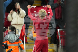 Liverpool's Andrew Robertson applauds the fans after the English League Cup third round soccer match between Liverpool and Southampton at the Anfield stadium in Liverpool, England, Tuesday, Sept. 23, 2025. (AP Photo/Jon Super)
