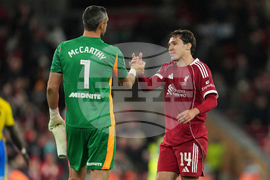 Liverpool's Federico Chiesa, right, and Southampton's goalkeeper Alex McCarthy shake hands after the English League Cup third round soccer match between Liverpool and Southampton at the Anfield stadium in Liverpool, England, Tuesday, Sept. 23, 2025. (AP Photo/Jon Super)