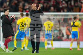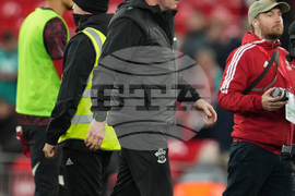 Southampton's head coach Will Still leaves the pitch after the English League Cup third round soccer match between Liverpool and Southampton at the Anfield stadium in Liverpool, England, Tuesday, Sept. 23, 2025. (AP Photo/Jon Super)
