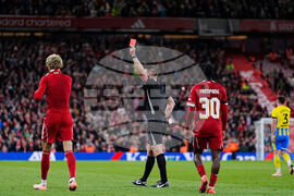 Liverpool's Hugo Ekitike gets a red card after taking his shirt off after scores his side's second goal during the English League Cup third round soccer match between Liverpool and Southampton at the Anfield stadium in Liverpool, England, Tuesday, Sept. 23, 2025. (Peter Byrne/PA via AP)