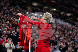 Liverpool's Hugo Ekitike celebrates after scoring his side's second goal during the English League Cup third round soccer match between Liverpool and Southampton at the Anfield stadium in Liverpool, England, Tuesday, Sept. 23, 2025. (Peter Byrne/PA via AP)