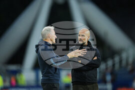 Manchester City's head coach Pep Guardiola, right, talks to Manchester City's Head of Security Barry South prior to the English League Cup third round soccer match between Huddersfield and Manchester City at the John Smith's stadium, in Huddersfield, England, Wednesday, Sept. 24, 2025. (AP Photo/Jon Super),