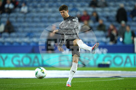 Manchester City's Nathan Ake plays the ball during a warm up session prior to the English League Cup third round soccer match between Huddersfield and Manchester City at the John Smith's stadium, in Huddersfield, England, Wednesday, Sept. 24, 2025. (AP Photo/Jon Super),