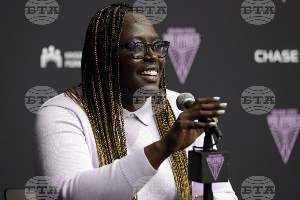 Golden State Valkyries' general manager Ohemaa Nyanin speaks during press conference in Oakland, Calif., on Tuesday, Sept. 23, 2025. (Scott Strazzante/San Francisco Chronicle via AP)