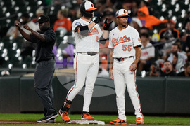 Baltimore Orioles relief pitcher Yaramil Hiraldo (76) and catcher Adley Rutschman, left, celebrate their team's victory over the Tampa Bay Rays after a baseball game, Tuesday, Sept. 23, 2025, in Baltimore. (AP Photo/Stephanie Scarbrough)
