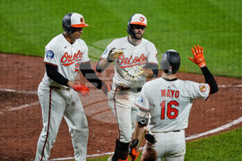 Baltimore Orioles' Colton Cowser, center, celebrates with Samuel Basallo, left, and Coby Mayo (16) after hitting a two-run home run during the sixth inning of a baseball game against the Tampa Bay Rays, Tuesday, Sept. 23, 2025, in Baltimore. (AP Photo/Stephanie Scarbrough)