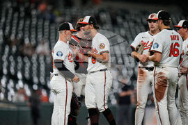 Baltimore Orioles relief pitcher Yaramil Hiraldo (76) celebrates his team's victory over the Tampa Bay Rays after a baseball game, Tuesday, Sept. 23, 2025, in Baltimore. (AP Photo/Stephanie Scarbrough)