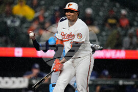 Baltimore Orioles' Samuel Basallo (29) reacts after being called out on strikes during the eighth inning of a baseball game against the Tampa Bay Rays, Tuesday, Sept. 23, 2025, in Baltimore. (AP Photo/Stephanie Scarbrough)