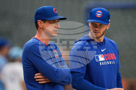 Chicago Cubs manager Craig Counsell (11), left, talks to Ian Happ (8) before a baseball game against the New York Mets, Tuesday, Sept. 23, 2025, in Chicago. (AP Photo/Erin Hooley)