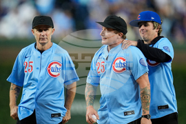 From left, Green Day band members Mike Dirnt, Tre Cool and Billie Joe Armstrong take the mound for a ceremonial first pitch before a baseball game between the Chicago Cubs and New York Mets, Tuesday, Sept. 23, 2025, in Chicago. (AP Photo/Erin Hooley)