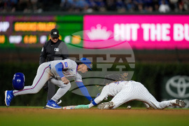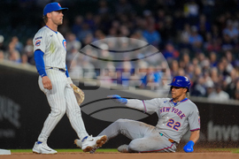 New York Mets' Juan Soto (22) slides by Chicago Cubs second baseman Nico Hoerner (2) as he steals second during the first inning of a baseball game Tuesday, Sept. 23, 2025, in Chicago. (AP Photo/Erin Hooley)