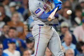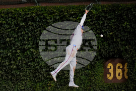 Chicago Cubs' Ian Happ (8) hits a two-run double during the second inning of a baseball game against the New York Mets, Tuesday, Sept. 23, 2025, in Chicago. (AP Photo/Erin Hooley)