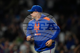 New York Mets manager Carlos Mendoza (64) returns to the dugout after making a pitching change during the second inning of a baseball game against the Chicago Cubs, Tuesday, Sept. 23, 2025, in Chicago. (AP Photo/Erin Hooley)