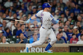 Chicago Cubs' Seiya Suzuki (27) runs to first on a one-run single during the sixth inning of a baseball game against the New York Mets, Tuesday, Sept. 23, 2025, in Chicago. (AP Photo/Erin Hooley)