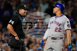 New York Mets' Juan Soto (22) has a brief chat with umpire John Libka (84) during the sixth inning of a baseball game Tuesday, Sept. 23, 2025, in Chicago. (AP Photo/Erin Hooley)