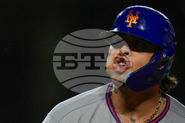 New York Mets first base coach Antoan Richardson (66) blows a bubble during the fourth inning of a baseball game against the Chicago Cubs, Tuesday, Sept. 23, 2025, in Chicago. (AP Photo/Erin Hooley)