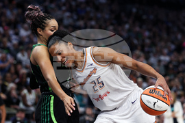 Minnesota Lynx guard Kayla McBride (21) works around Phoenix Mercury guard Kahleah Copper during the second half of Game 2 of a WNBA basketball playoff semifinals series Tuesday, Sept. 23, 2025, in Minneapolis. (AP Photo/Matt Krohn)