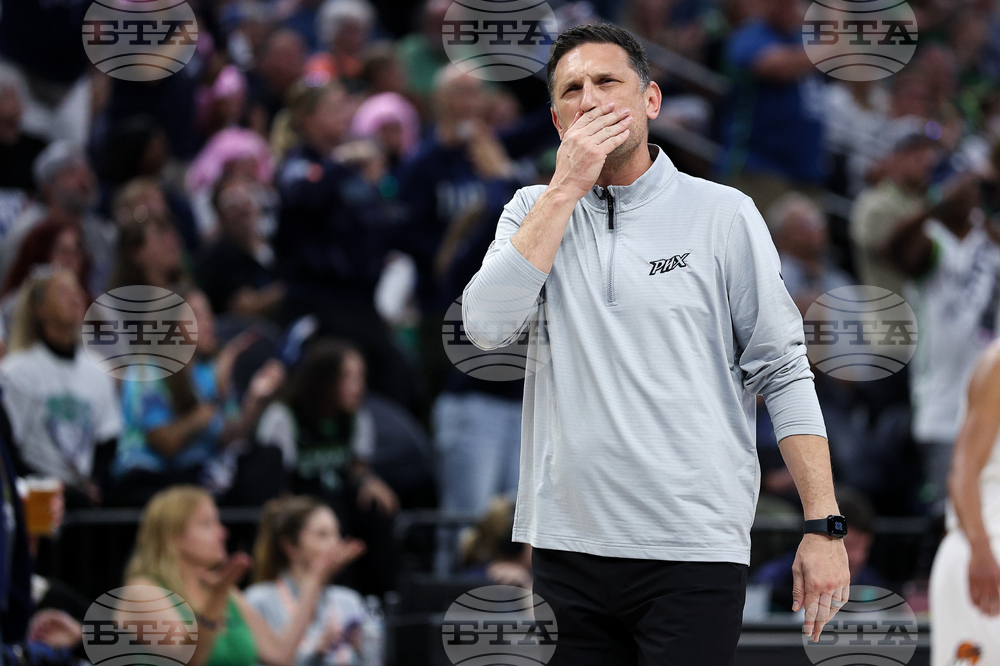 Phoenix Mercury head coach Nate Tibbetts reacts during the first half of Game 2 of a WNBA basketball playoff semifinals series against the Minnesota Lynx Tuesday, Sept. 23, 2025, in Minneapolis. (AP Photo/Matt Krohn)