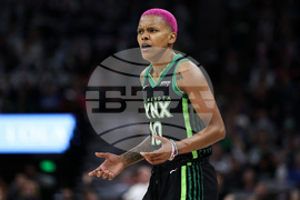Minnesota Lynx guard Courtney Williams (10) reacts during the first half of Game 2 of a WNBA basketball playoff semifinals series against the Phoenix Mercury Tuesday, Sept. 23, 2025, in Minneapolis. (AP Photo/Matt Krohn)