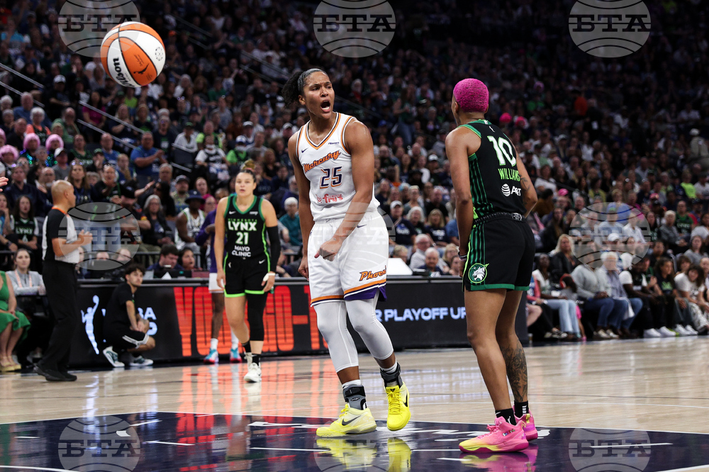 Phoenix Mercury forward Alyssa Thomas, left, reacts to a possession call towards referee Ashley Gloss during the first half of Game 2 of a WNBA basketball playoff semifinals series against the Minnesota Lynx Tuesday, Sept. 23, 2025, in Minneapolis. (AP Photo/Matt Krohn)