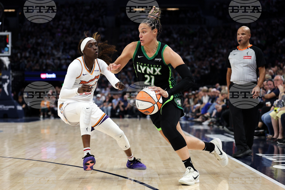 Minnesota Lynx guard Kayla McBride (21) controls the ball as Phoenix Mercury guard Kahleah Copper, center, defends during the second half of Game 2 of a WNBA basketball playoff semifinals series Tuesday, Sept. 23, 2025, in Minneapolis. (AP Photo/Matt Krohn)