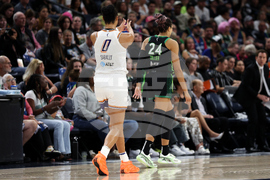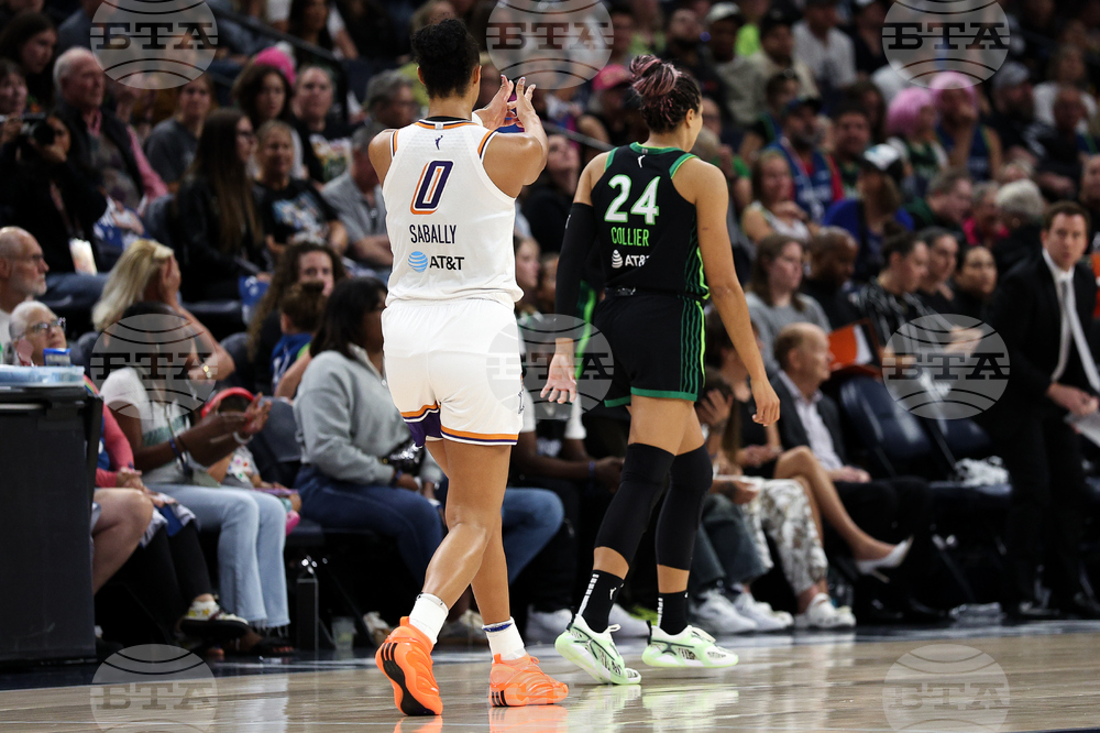 Phoenix Mercury forward Satou Sabally (0) celebrates her 3-point basket towards Minnesota Lynx forward Napheesa Collier (24) during the second half of Game 2 of a WNBA basketball playoff semifinals series Tuesday, Sept. 23, 2025, in Minneapolis. (AP Photo/Matt Krohn)