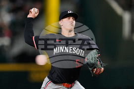 Minnesota Twins starting pitcher Zebby Matthews throws to the Texas Rangers in the first inning of a baseball game Tuesday, Sept. 23, 2025, in Arlington, Texas. (AP Photo/Tony Gutierrez)