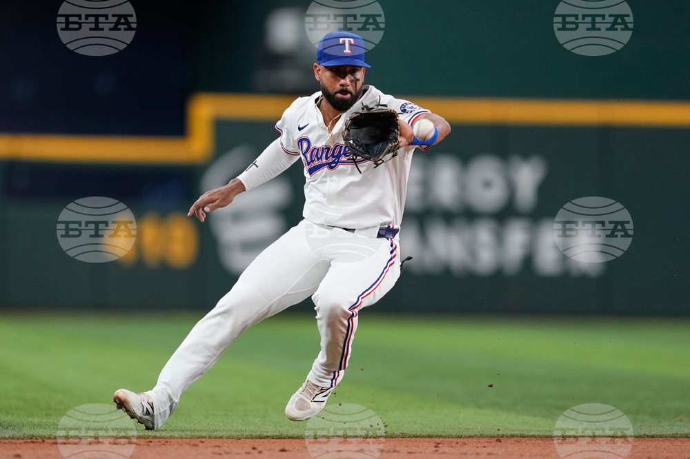 Texas Rangers shortstop Ezequiel Duran reaches out to field a ground ball by Minnesota Twins' Ryan Jeffers in the first inning of a baseball game Tuesday, Sept. 23, 2025, in Arlington, Texas. (AP Photo/Tony Gutierrez)