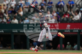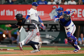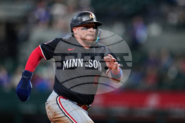 Minnesota Twins' Christian Vazquez advances to third on a fly out by Byron Buxton in the eighth inning of a baseball game against the Texas Rangers Tuesday, Sept. 23, 2025, in Arlington, Texas. (AP Photo/Tony Gutierrez)