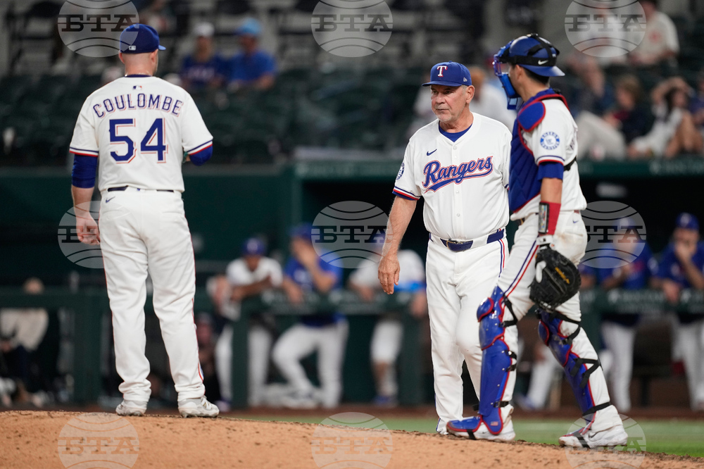 Texas Rangers manager Bruce Bochy comes out of the dugout to make a pitching change in the fourth inning of a baseball game against the Minnesota Twins Tuesday, Sept. 23, 2025, in Arlington, Texas. (AP Photo/Tony Gutierrez)