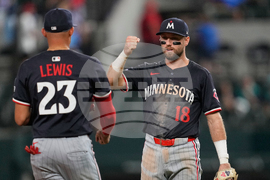Minnesota Twins third baseman Royce Lewis (23) and Kody Clemens (18) celebrate the team's win in a baseball game against the Texas Rangers Tuesday, Sept. 23, 2025, in Arlington, Texas. (AP Photo/Tony Gutierrez)