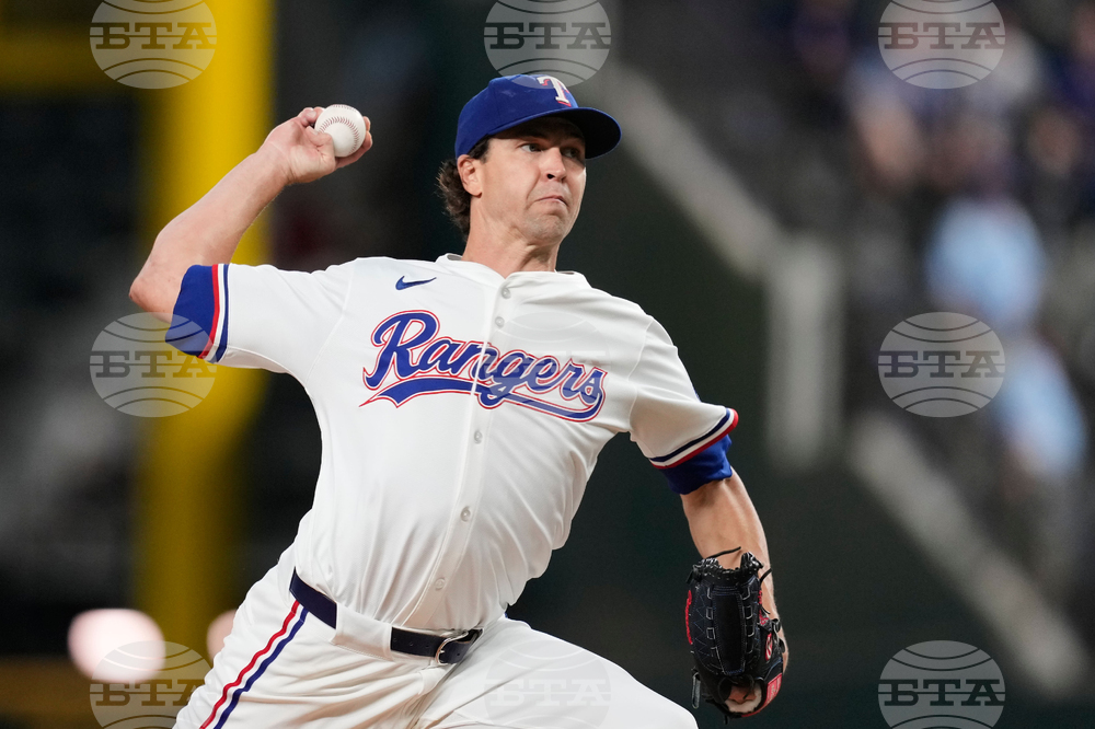 Texas Rangers starting pitcher Patrick Corbin throws to the Minnesota Twins in the first inning of a baseball game Tuesday, Sept. 23, 2025, in Arlington, Texas. (AP Photo/Tony Gutierrez)