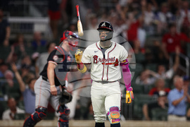 Atlanta Braves' Ronald Acuña Jr. flips his bat after hitting a solo home run in the sixth inning of a baseball game against the Washington Nationals, Tuesday, Sept. 23, 2025, in Atlanta. (AP Photo/Colin Hubbard)