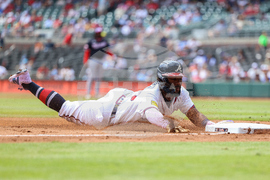 Atlanta Braves' Michael Harris II steals third base in the fifth inning of a baseball game against the Washington Nationals, Wednesday, Sept. 24, 2025, in Atlanta. (AP Photo/Colin Hubbard)