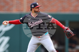 Washington Nationals second baseman Luis García Jr. throws to first base in the eighth inning of a baseball game against the Atlanta Braves, Wednesday, Sept. 24, 2025, in Atlanta. (AP Photo/Colin Hubbard)