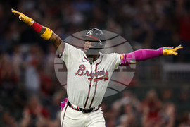 Atlanta Braves' Ronald Acuña Jr. reacts after hitting a solo home run in the sixth inning of a baseball game against the Washington Nationals, Tuesday, Sept. 23, 2025, in Atlanta. (AP Photo/Colin Hubbard)