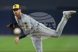 Milwaukee Brewers relief pitcher Jared Koenig works against a San Diego Padres batter during the eighth inning of a baseball game Wednesday, Sept. 24, 2025, in San Diego. (AP Photo/Gregory Bull)