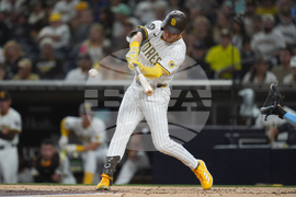 San Diego Padres' Luis Arraez walks back towards the dugout after grounding into a double play during the sixth inning of a baseball game against the Milwaukee Brewers Tuesday, Sept. 23, 2025, in San Diego. (AP Photo/Gregory Bull)