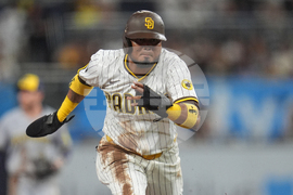 San Diego Padres' Luis Arraez advances from second to third base off a single by Ramon Laureano during the first inning of a baseball game against the Milwaukee Brewers Tuesday, Sept. 23, 2025, in San Diego. (AP Photo/Gregory Bull)
