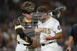 San Diego Padres catcher Freddy Fermin, left, puts his arms around starting pitcher Randy Vasquez after Vasquez was hit by a line out by Milwaukee Brewers' Caleb Durbin during the fourth inning of a baseball game Tuesday, Sept. 23, 2025, in San Diego. (AP Photo/Gregory Bull)